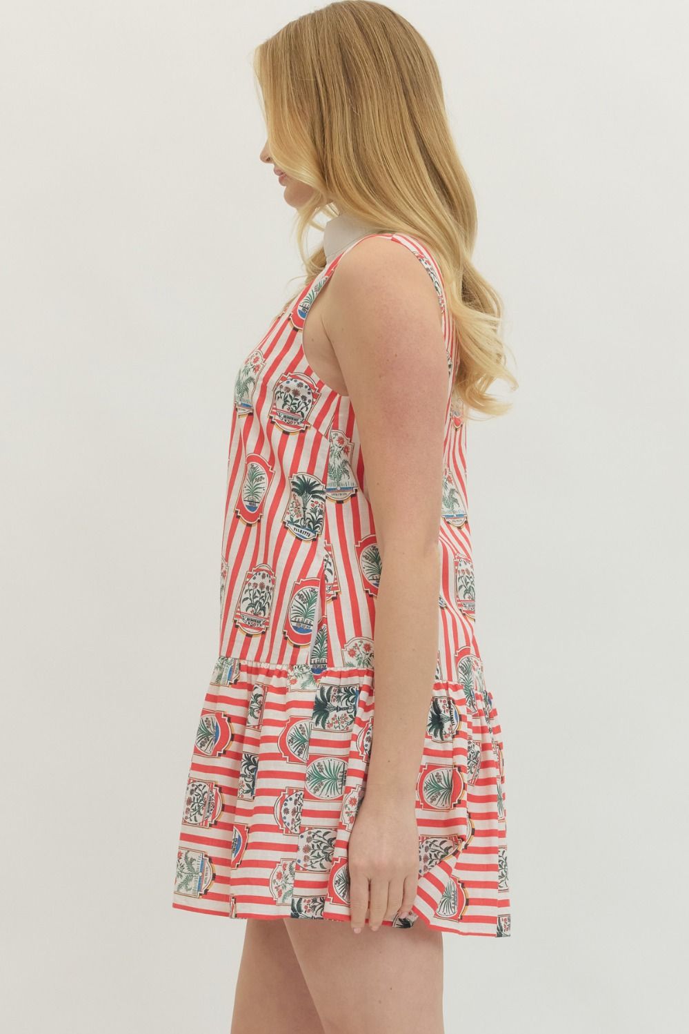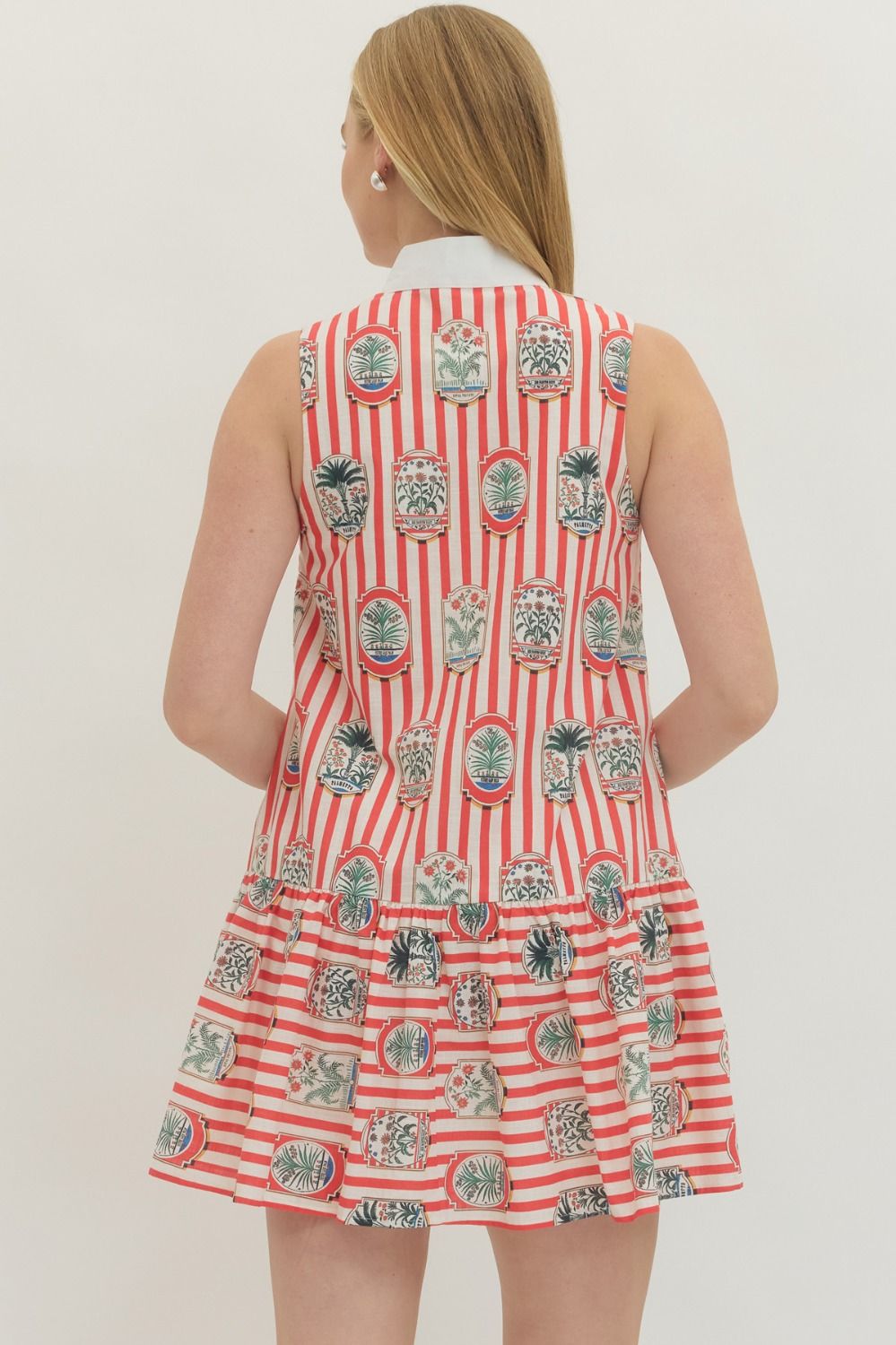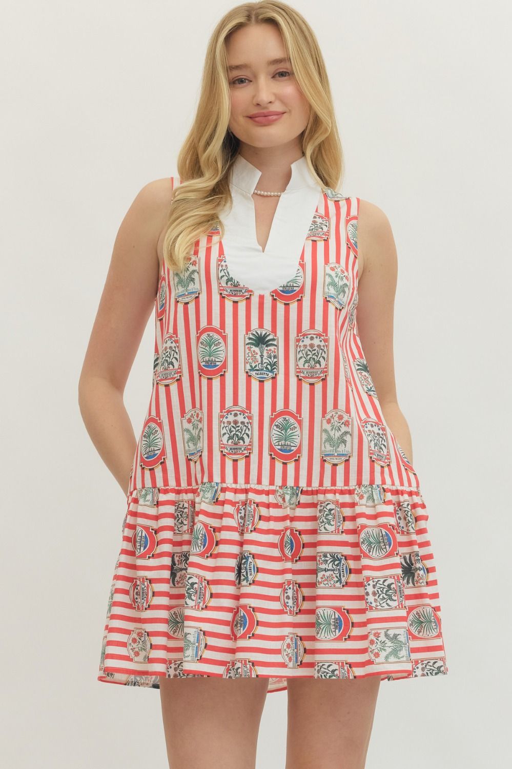 The dress that does all the talking. This red and ivory striped mini features a playful garden print layered over vertical stripes for a statement-making look that still feels polished. The drop waist silhouette gives it that easy, swingy shape we love, while the tailored white collar adds just enough structure.