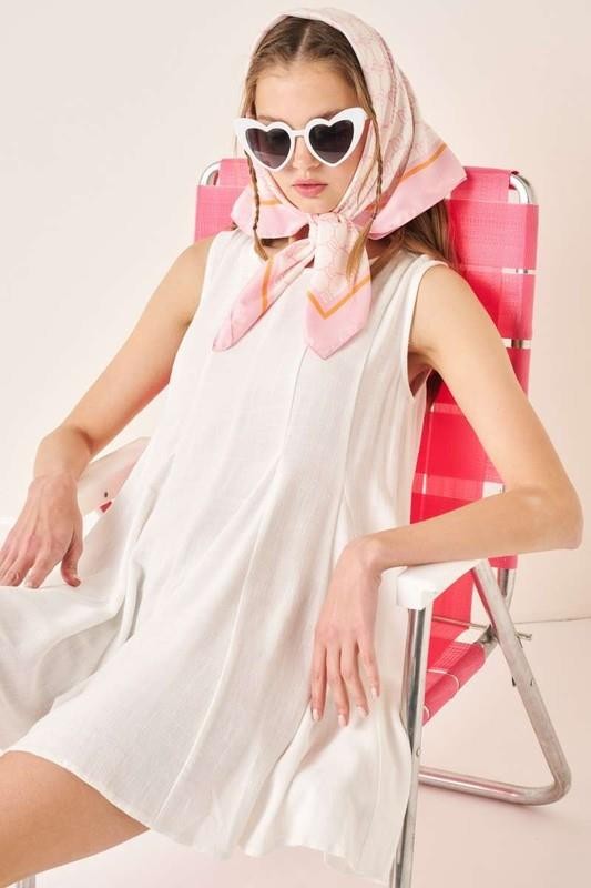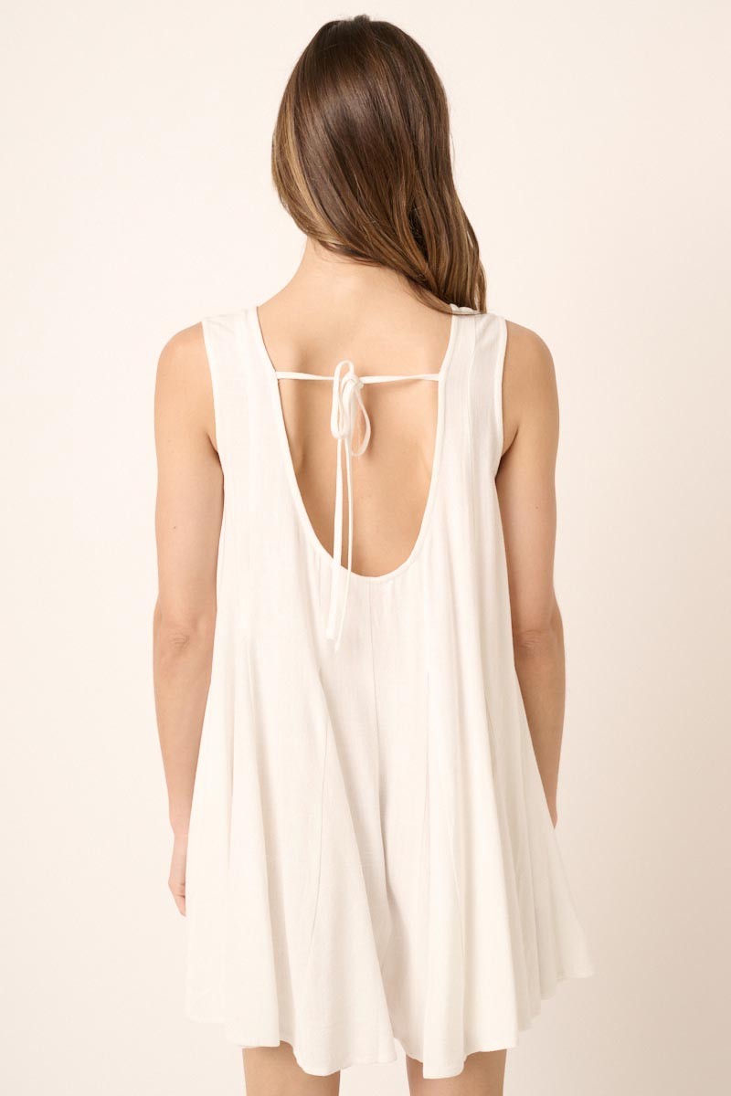 Designed with a classic round neckline in the front and a flattering scoop back with an adjustable tie detail, it adds the perfect touch of laid back charm. The sleeveless silhouette and flowy wide leg shape make it ultra comfortable, while the subtle godet detail at the bottom gives it a little extra movement and style.