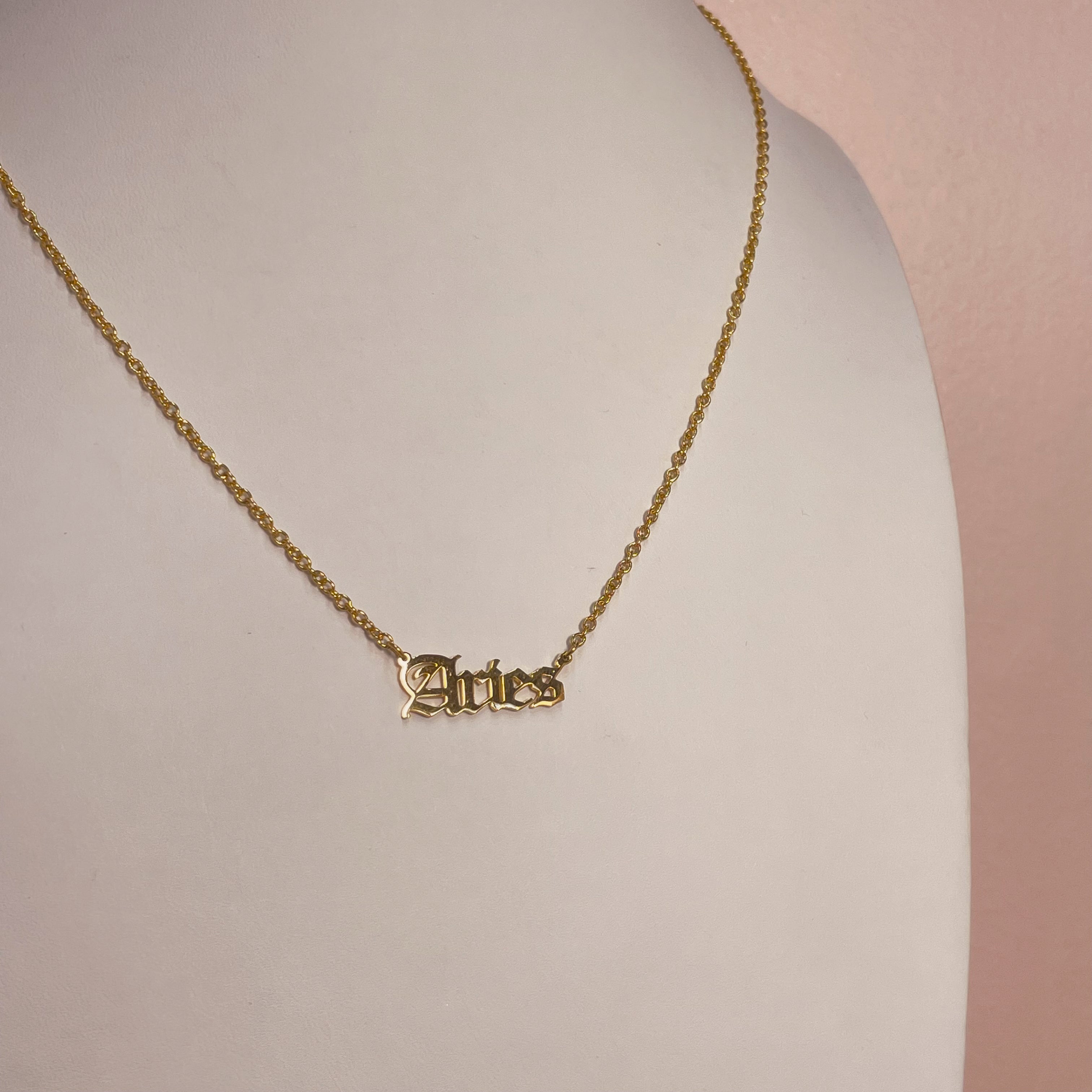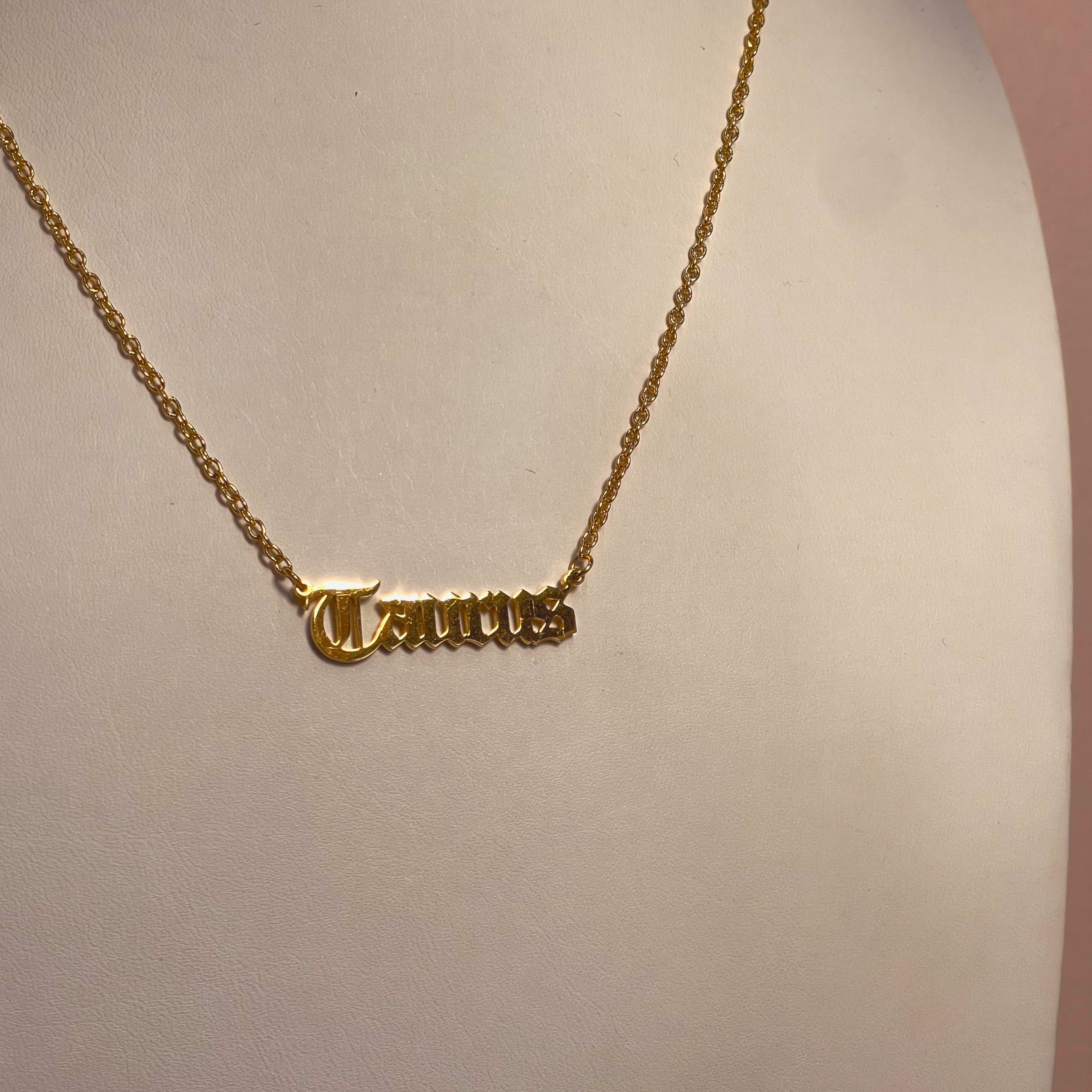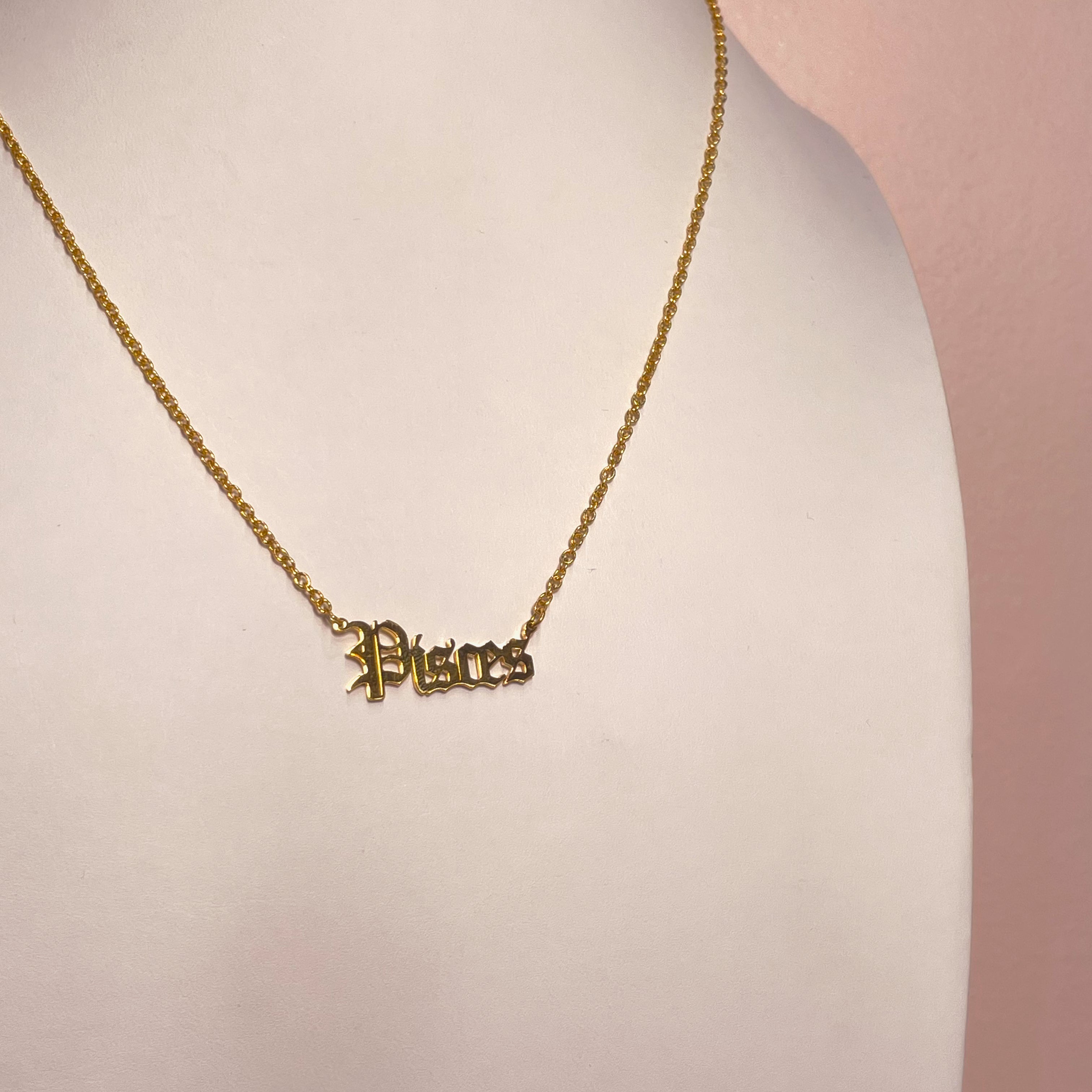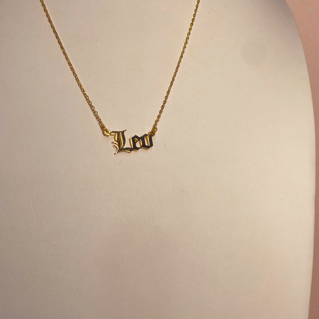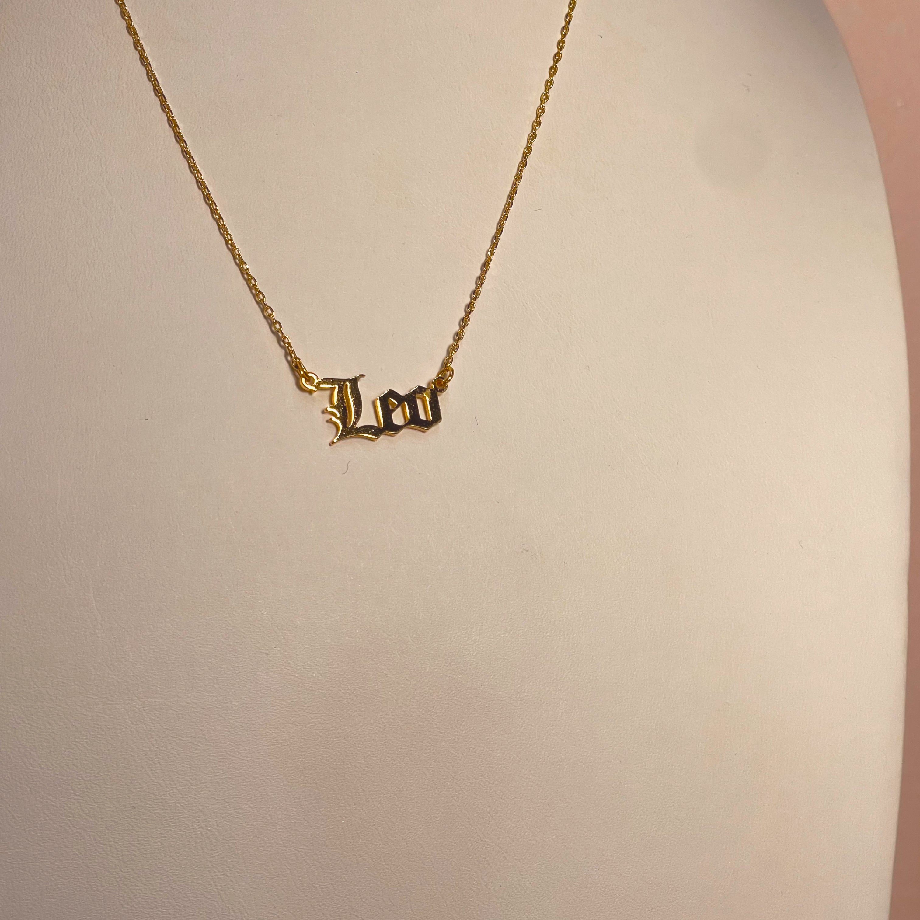 Gold Zodiac Necklace in an old english type font. Perfect for any outfit and any season especially your season!