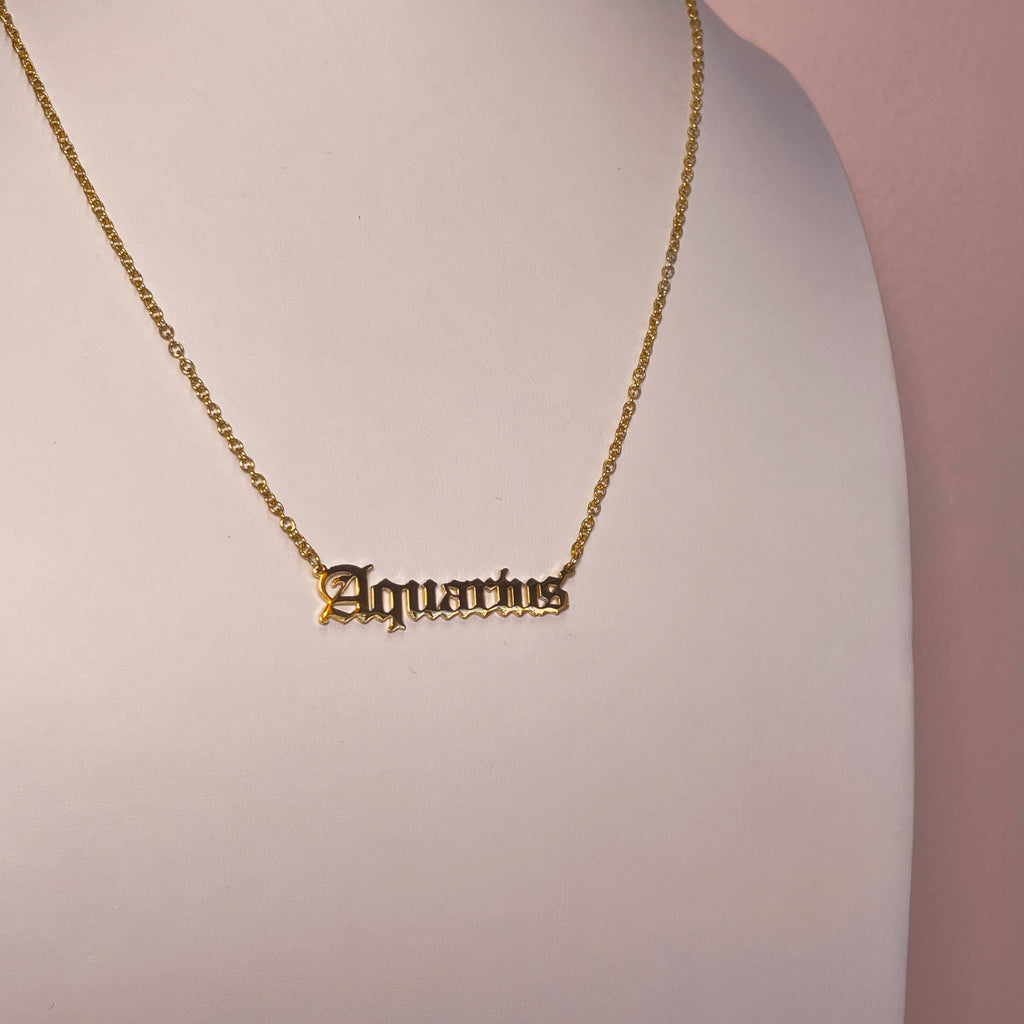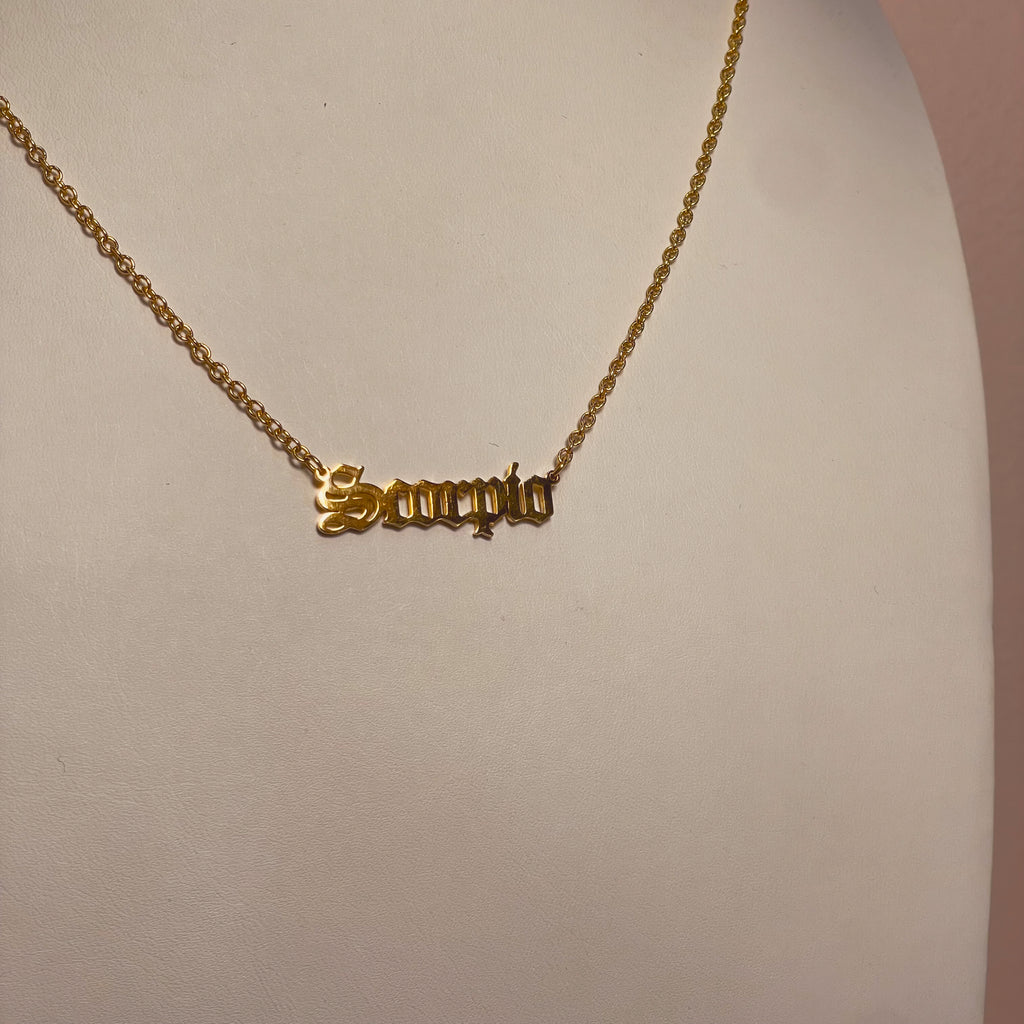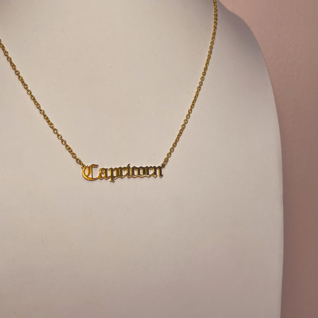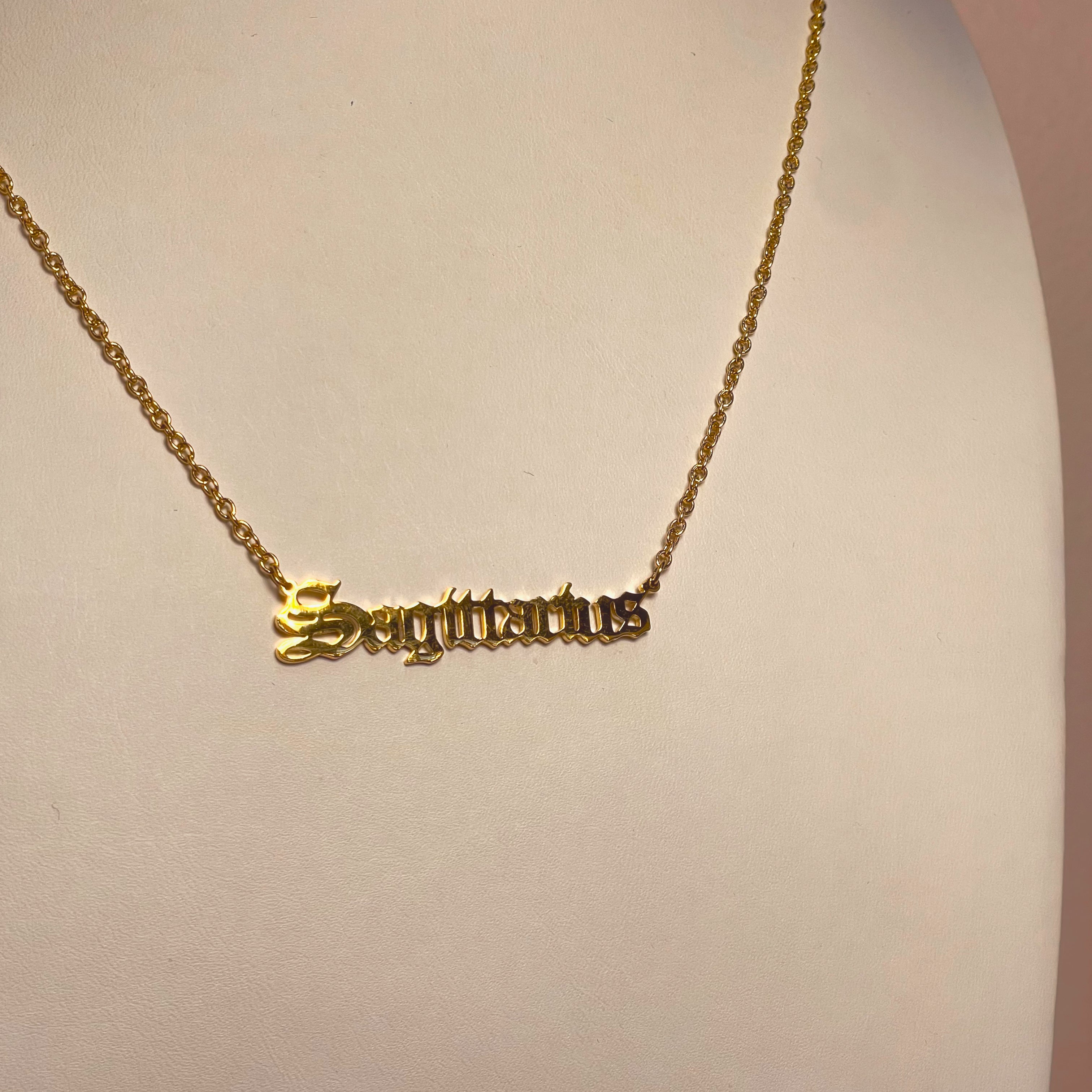 Gold Zodiac Necklace in an old english type font. Perfect for any outfit and any season especially your season!