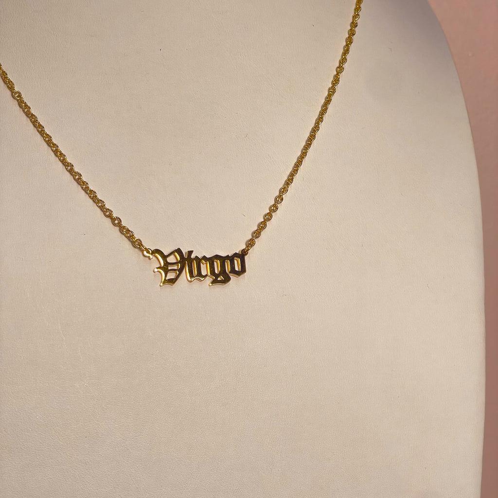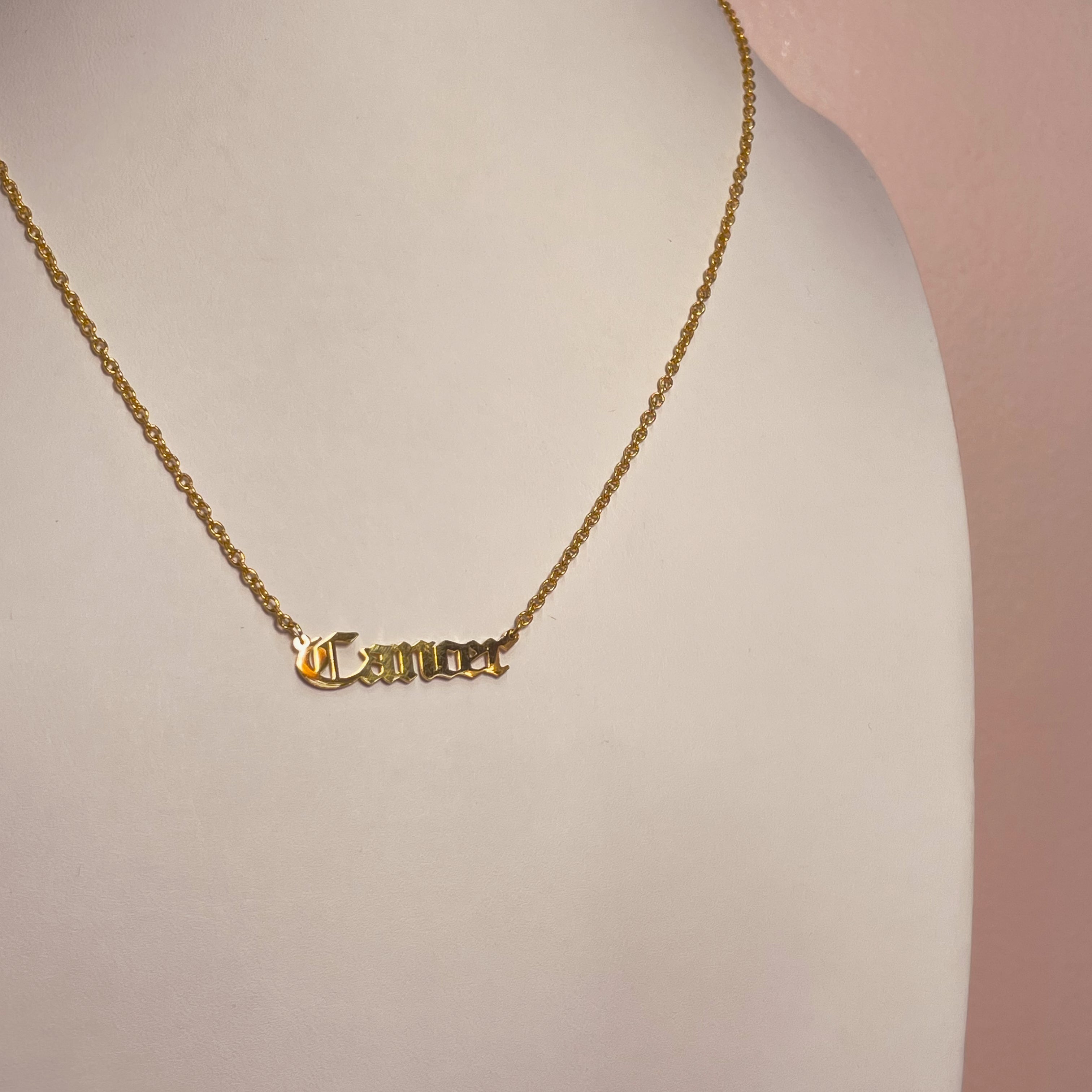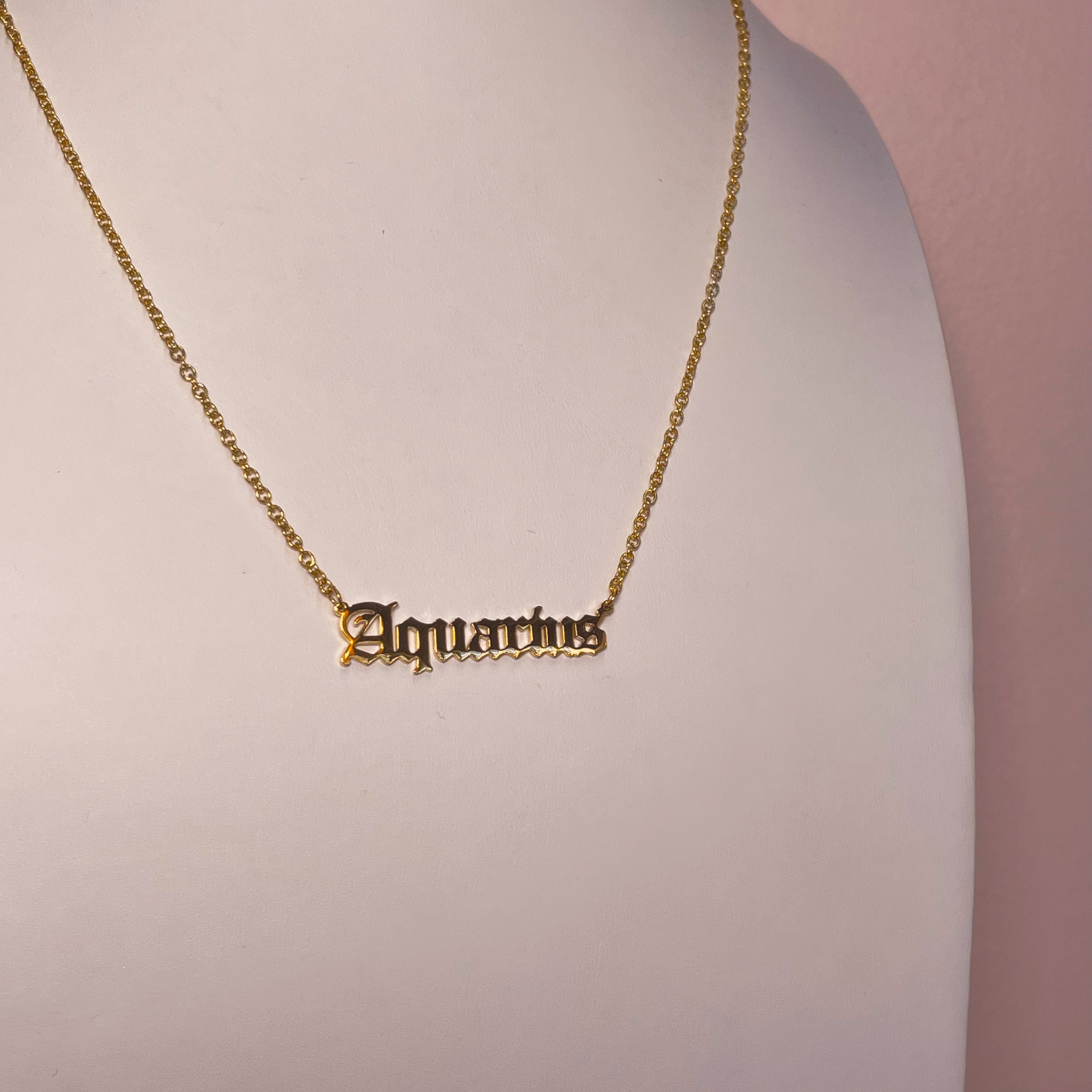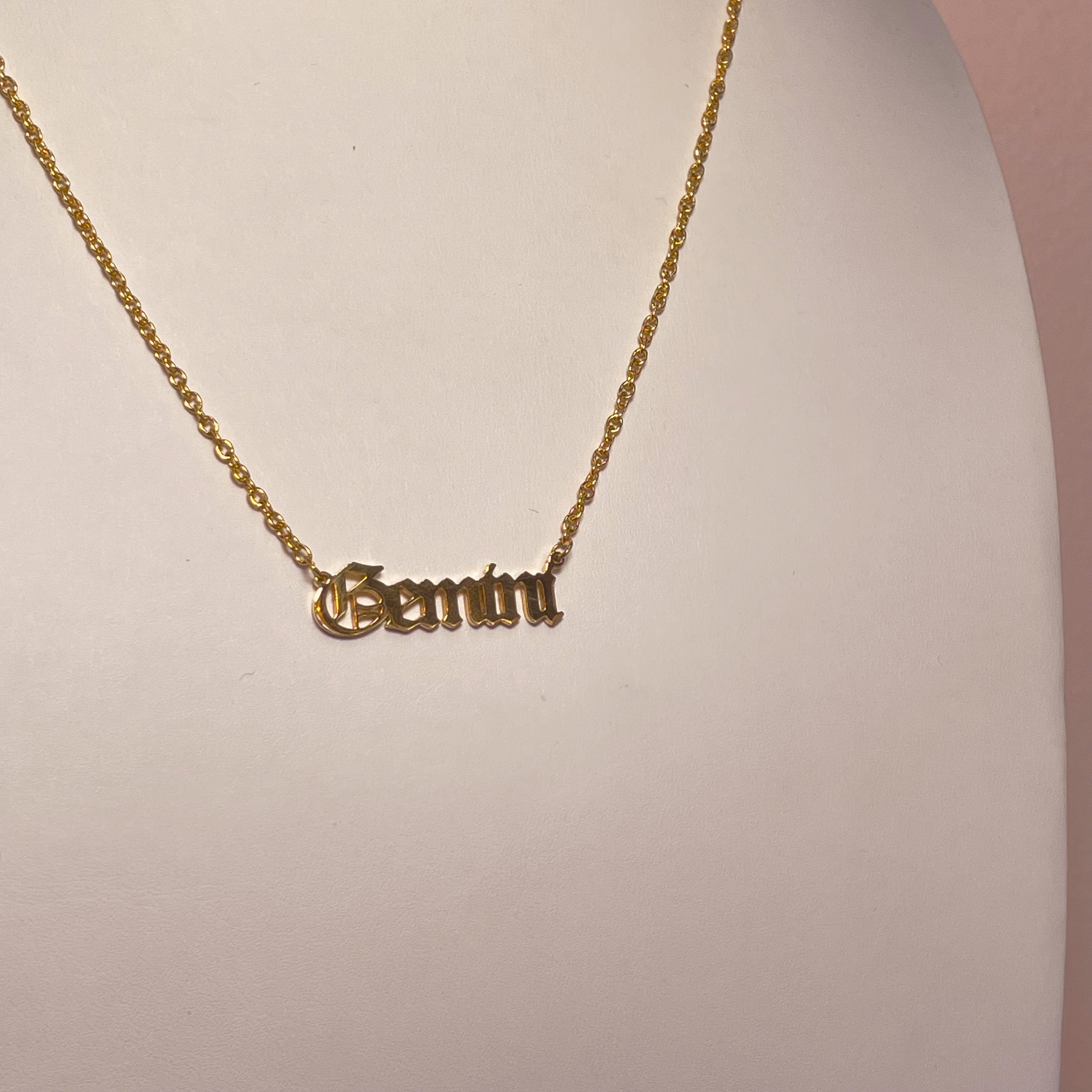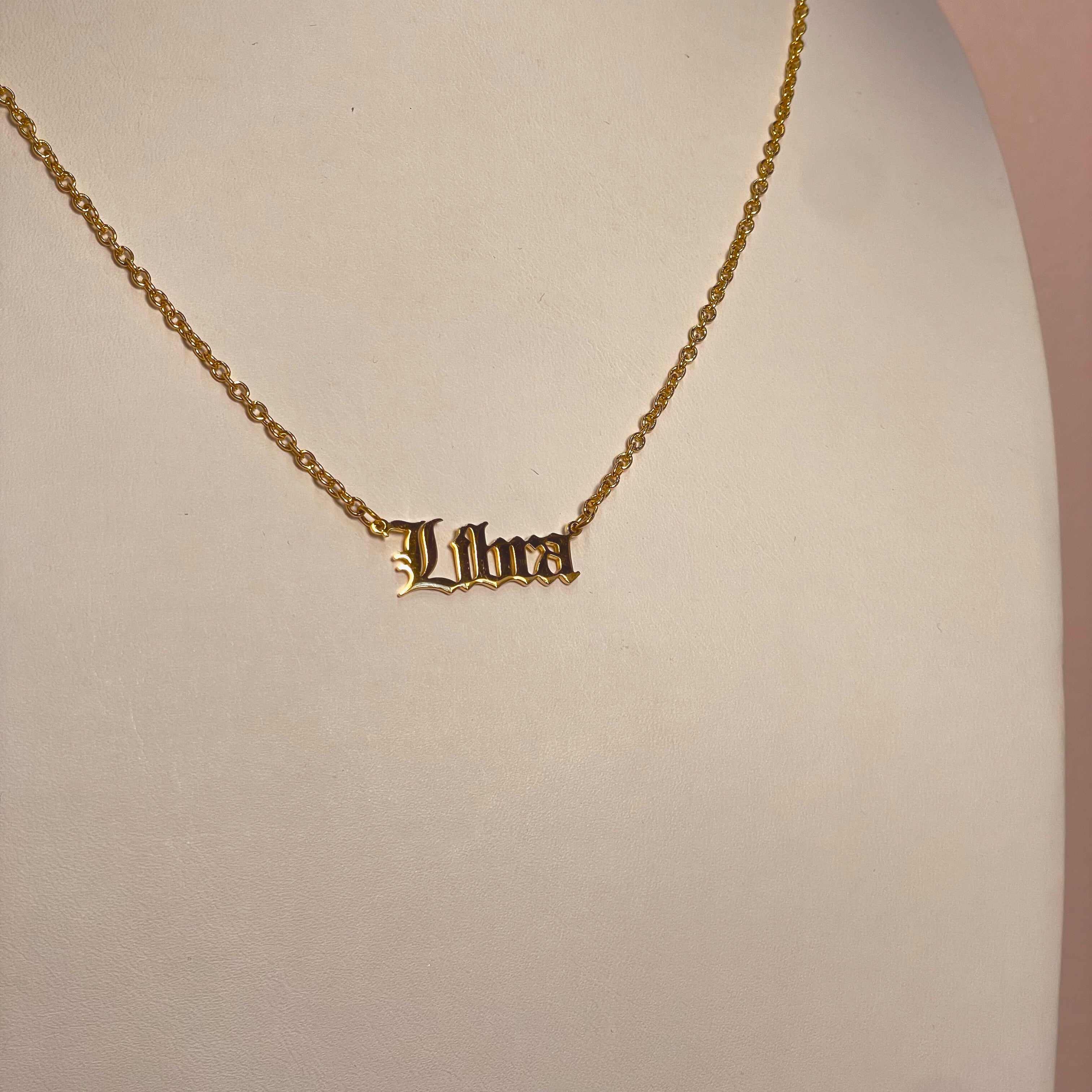 Gold Zodiac Necklace in an old english type font. Perfect for any outfit and any season especially your season!